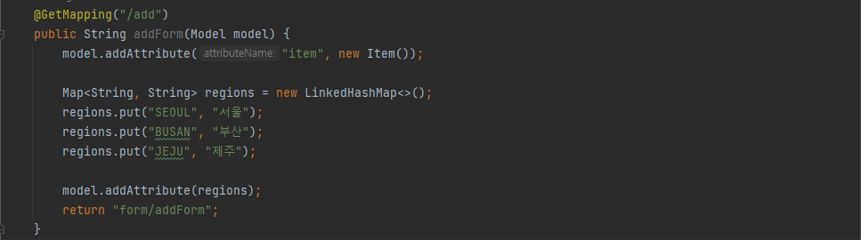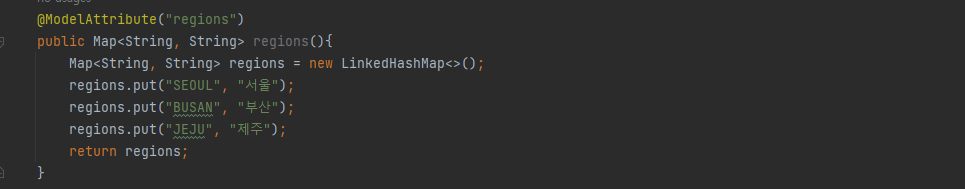 컨트롤러에 이렇게 담아두면 해당 컨트롤러 부분이 호출될 때 regions에서 반환한 값이 자동으로 모델에 담기게 된다.
