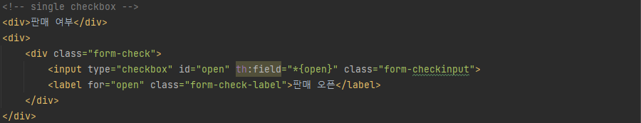 이 때 이전 체크 여부에 따라 체크가 true인지 false인지 알아서 되어있는 상태인데 이것도 타임리프의 th:field가 자동화해주는 부분이다.