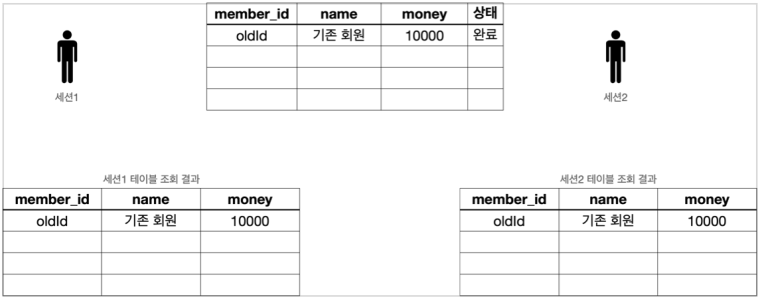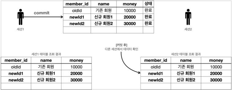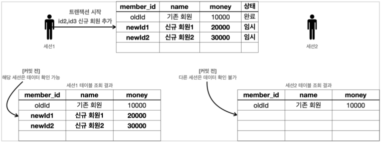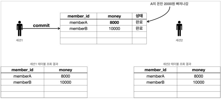 - 따라서 해당 트랜잭션을 시작한 세션(사용자)에게만 변경 데이터가 보이고, 다른 세션에게는 변경 데이터가 보이지 않는다.