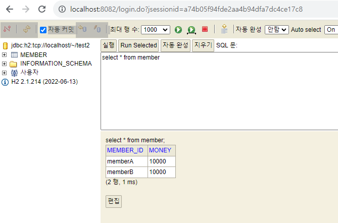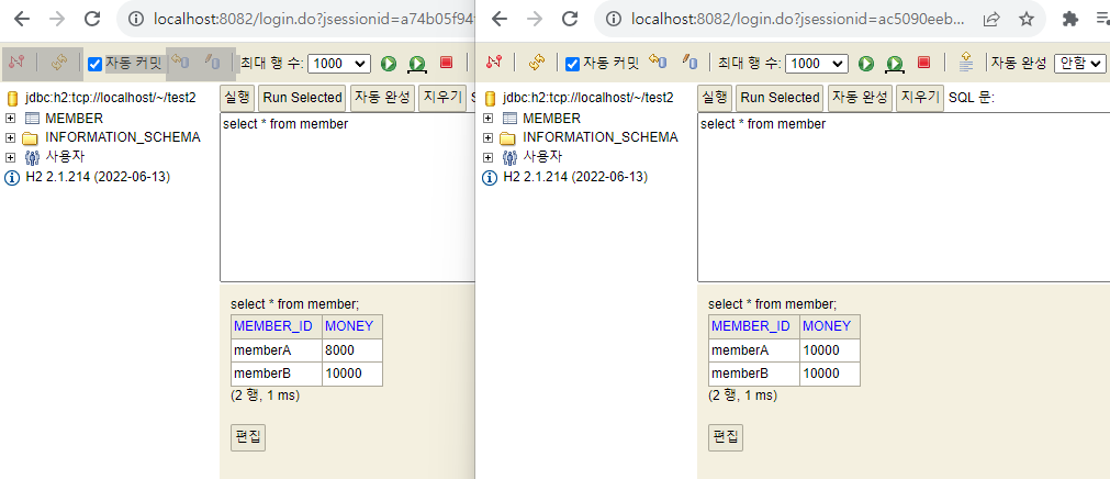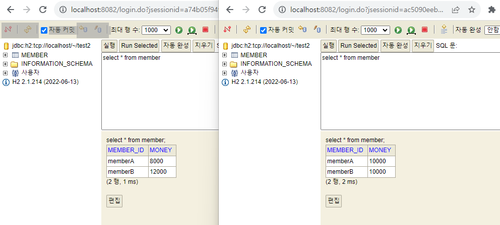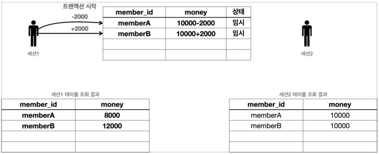 - memberA의 돈을 memberB에게 2000원 계좌이체하는 트랜잭션을 실행한다.