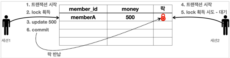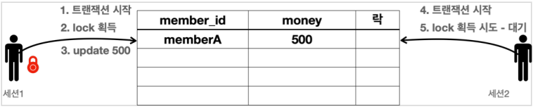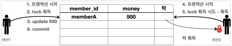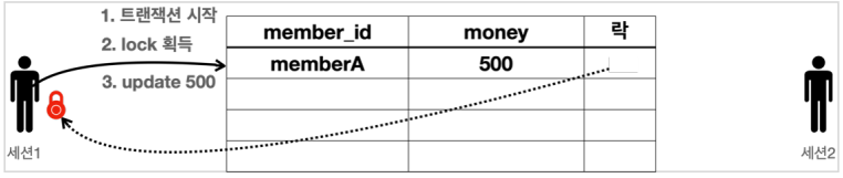 - 세션1은 MemberA의 money를 500으로 변경하려고 시도한다. 이 때 해당 로우(행)의 락을 먼저 획득해야 한다.