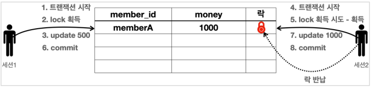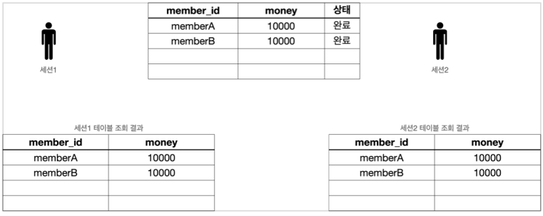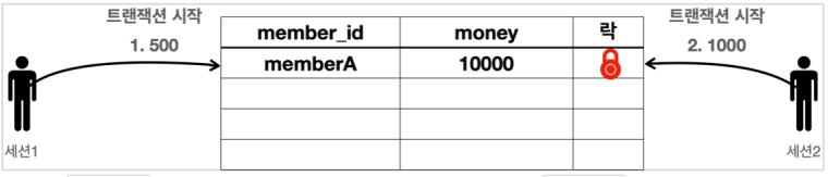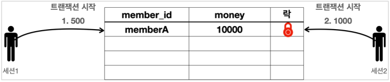 - 세션 1은 MemberA의 금액을 500원으로 변경하고 싶고, 세션 2는 1000원으로 변경하고 싶은 상황이다.