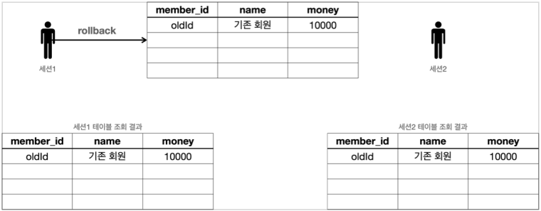 - 이 때 세션1이 롤백을 수행하면?