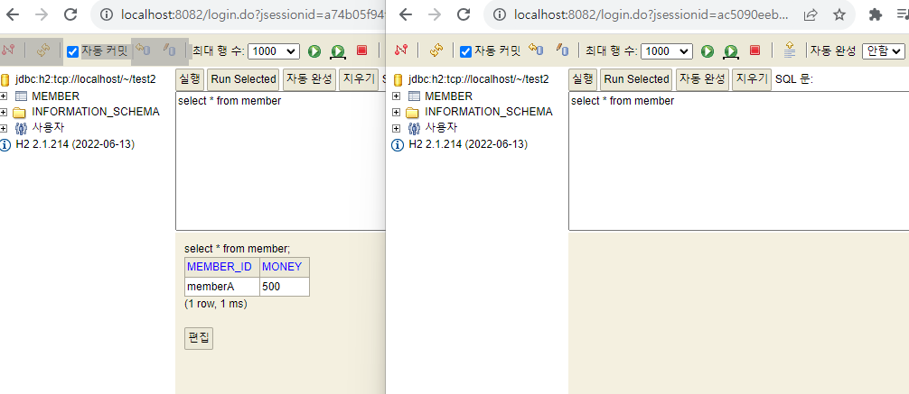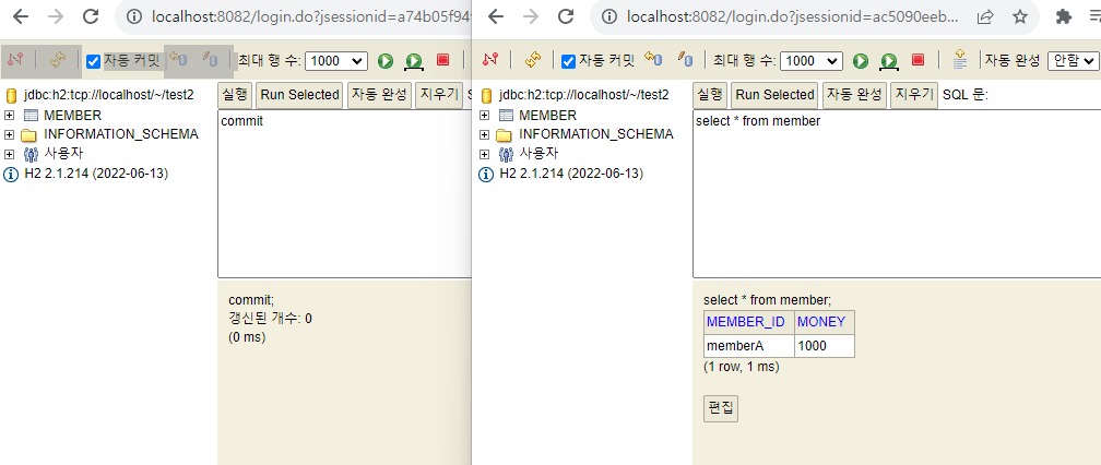 위와 같이 각각의 세션에서 쿼리를 입력하고 실행시킨 후 양쪽에서 조회해보면 위와 같은 결과가 나온다.