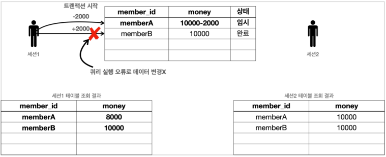 이 두 가지 작업이 합쳐져 하나의 작업처럼 동작해야 한다. 만약 A쪽에서는 성공했는데 B쪽에서 실패한다면 A의 5000원만 사라지는 심각한 문제가 발생하는 것이다.