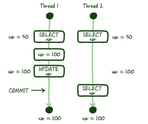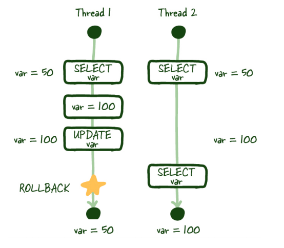 T1이 업데이트 이후 롤백을 하여 커밋되지 않은 데이터가 됐음에도 불구하고 T2는 이미 커밋이 되었다 라고 판단하게 되는 것이다.