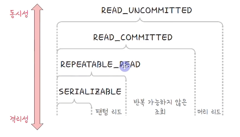 격리성은 여러가지 단계가 있고 해당 단계에 따라 격리성과 동시성의 정도가 달라지게 된다. 이러한 단계들은 DB에서 조정할 수 있다.