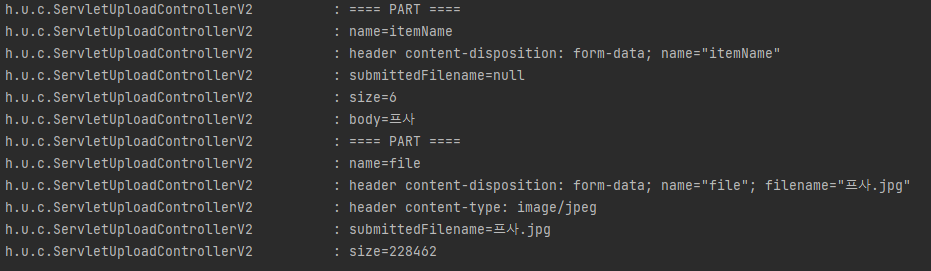 첫 파트는 파일명의 itemName, 그리고 header 정보, submittedFilename은 사용자가 보낸 파일 명이기때문에 null, 등등의 정보를 볼 수 있다.