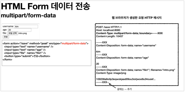 위와 같이 이름과 나이는 문자로 전송하고, 첨부파일은 바이너리로 전송해야하는 상황이 흔하다. 문자와 바이너리를 동시에 전송해야 한다는 것이 문제인 것이다.