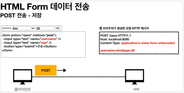 그리고 폼에 입력한 전송할 항목을 HTTP Body에 username=kim&age=20 같이 &로 구분해 보낸다.