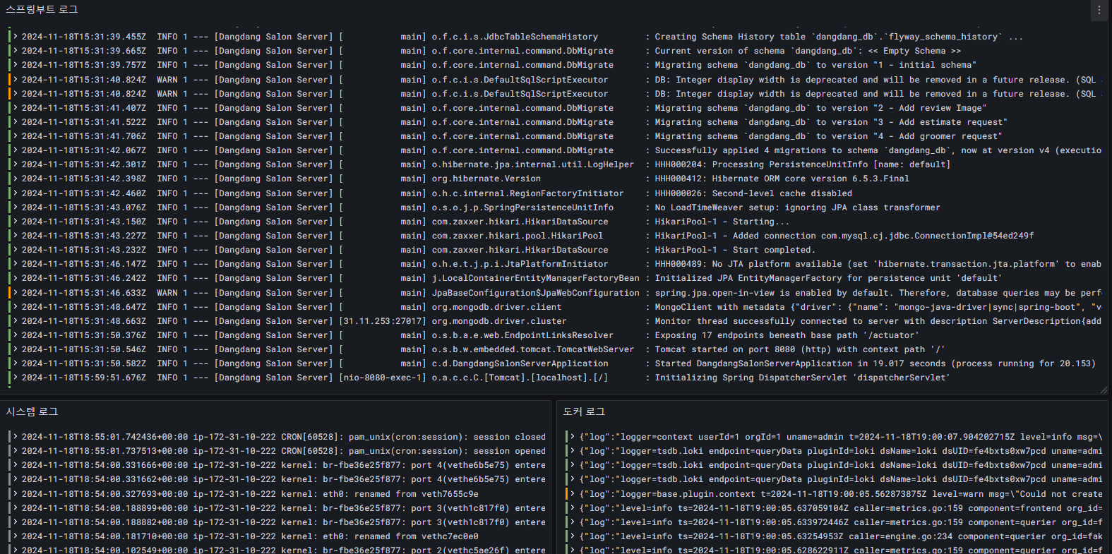 2024-11-18T15:31:39.757Z INFO 1 --- [Dangdang Salon Server] [ main] o.f.core.internal.command.DbMigrate : Migrating schema `dangdang_db` to version "1 - initial schema"