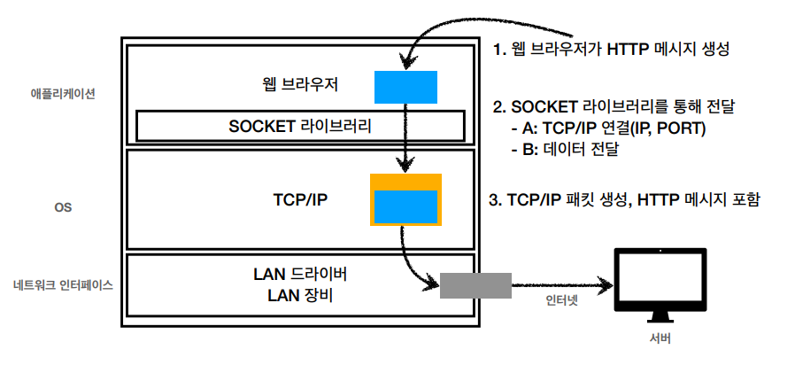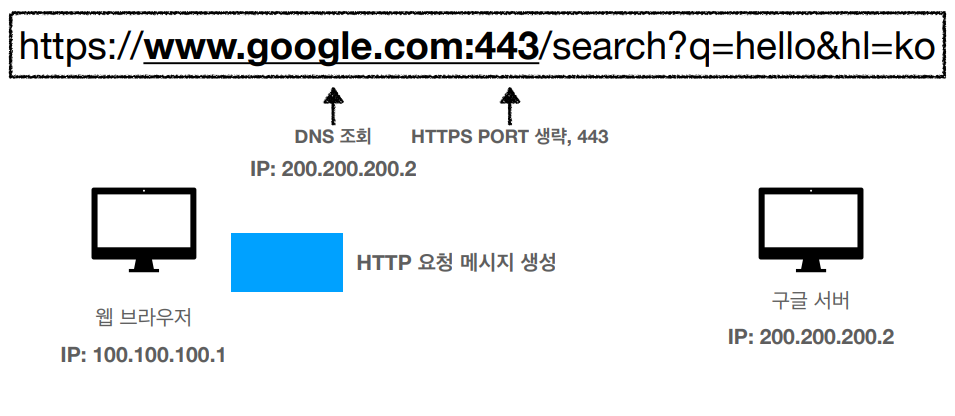 DNS를 조회하고 IP주소를 알아낸다. 그리고 HTTP요청 메시지를 생성한다.