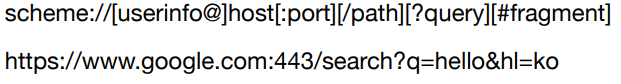 - scheme : 주로 프로토콜로 사용된다. 프로토콜은 어떤 방식으로 자원에 접근할 것인가 하는 약속 규칙이다.