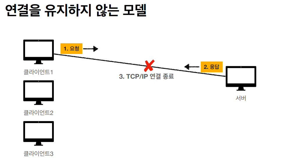 - HTTP는 기본이 연결을 유지하지 않는 모델이다.