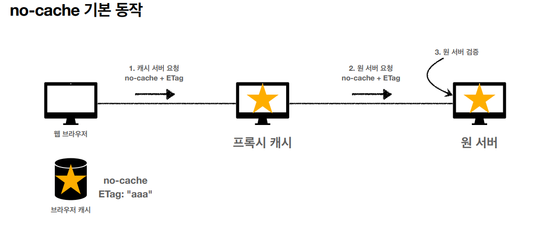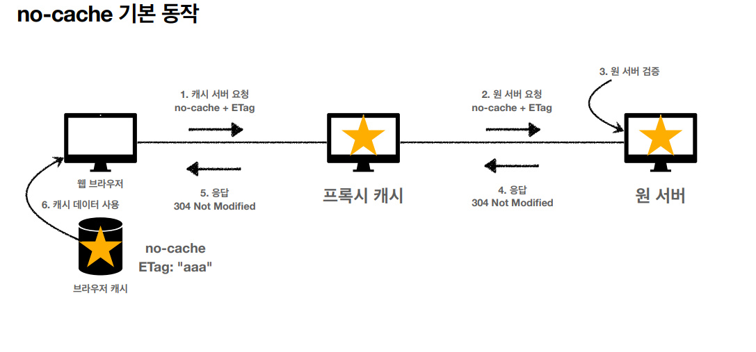 - Cache-Control: no-cache -> 데이터는 캐시해도 되지만, 항상 origin 서버에 검증하고 사용해라. (중간에 캐시 서버가 따로 있는 경우가 있는데 여기서 마치지 말고 origin 서버에 검증해라.)
