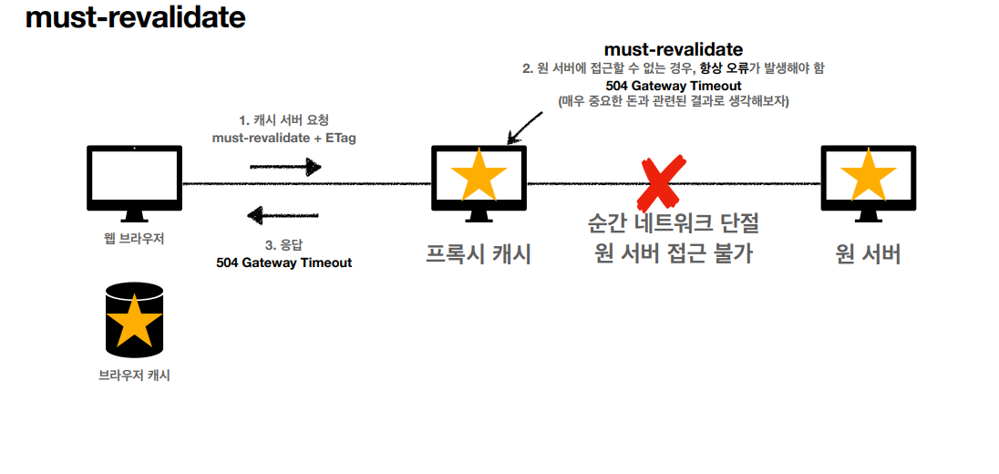 같은 경우 must-revalidate는 200 OK가 아닌 504 Gateway-Timeout을 응답하게 된다.