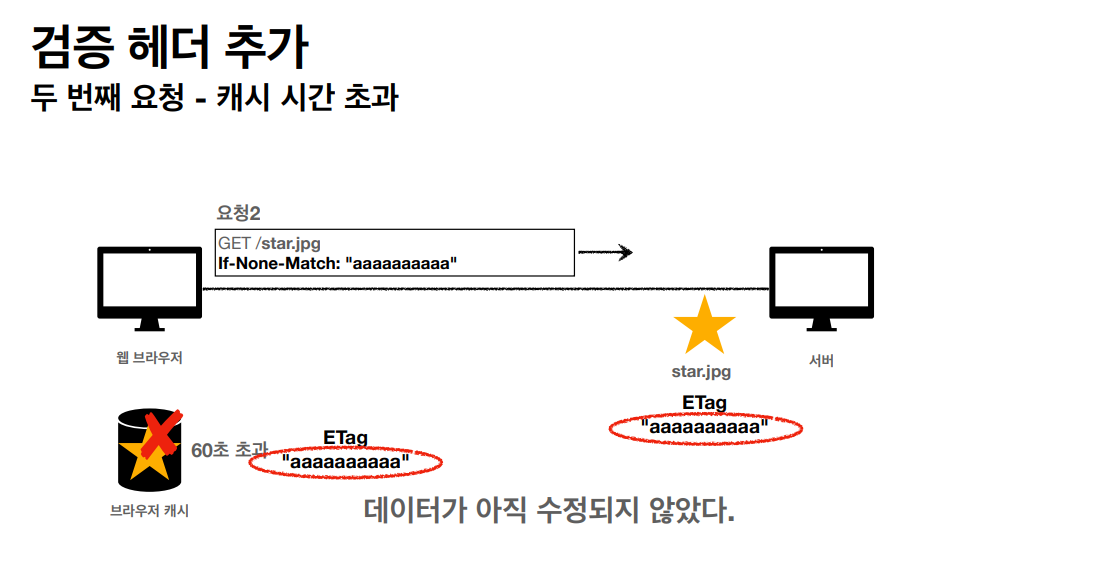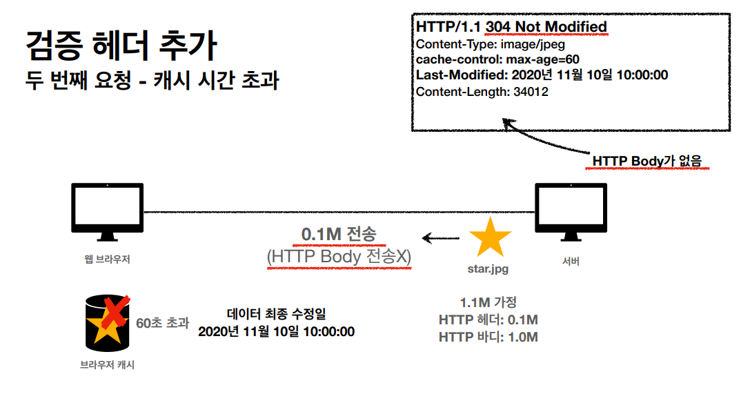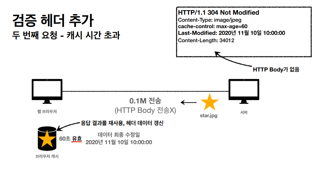 - 캐시 유효 시간이 초과해도, 서버의 데이터가 갱신되지 않으면 바디를 제외하고 304 Not Modified + 헤더 메타 정보만 응답한다.