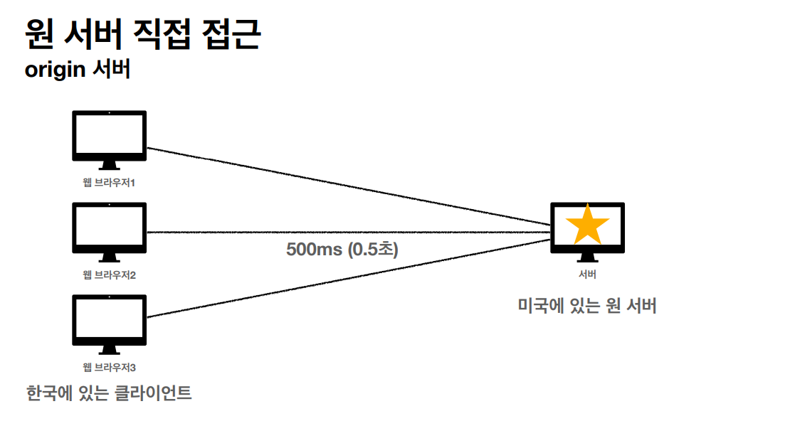 위와 같이 원서버에 직접 접근한다하면 거리가 멀기 때문에 어쩔 수 없이 물리적으로 어느 정도의 시간이 걸리게 된다.