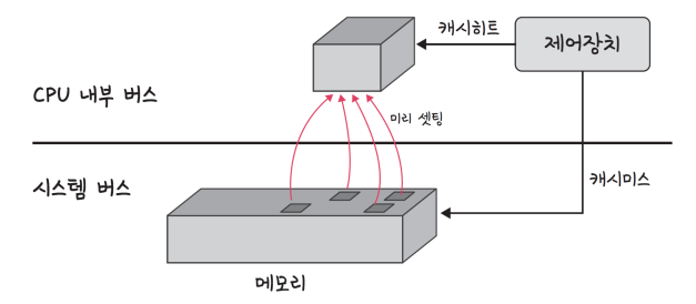 즉, 위의 이미지로 보면 캐시미스가 발생하면 제어장치가 메모리에 가서 CPU의 레지스터에 해당 데이터를 미리 세팅을 해두는 것이고, 캐시히트가 일어나는 것은 원하는 데이터가 CPU의 레지스터에 미리 세팅되어있는 데이터인 것이다.