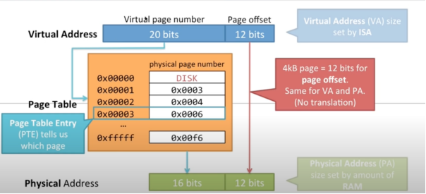 위의 사진을 보면 가상주소는 20bits로 주소를 관리해 실제주소인 16bits보다 더 많은 주소를 할당한다.