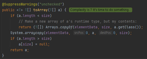 위 코드는 ArrayList의 toArray() 메서드이다. 해당 부분을 실제로 보면 @SuppressWarnings가 적용되어 있다.
