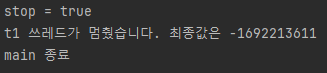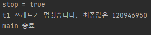 System.out.println("t1 쓰레드가 멈췄습니다. 최종값은 " + i);