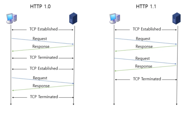 수명이 짧은 연결이라고 한다. HTTP요청은 자체 요청에서 완료가 된다. HTTP 요청당 TCP 핸드셰이크가 발생되며 기본적으로 한 연결당 하나의 요청을 처리하도록 설계되었다. 한번 연결할 때마다 TCP 연결을 계속 해야하니 RTT가 늘어나는 문제가 있었다.