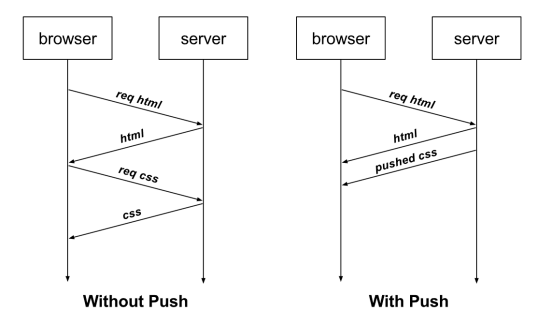 서버가 리소스를 클라이언트에 푸시할 수 있다. 요청된 html파일과 함께 다른 개체를 별도로 보낼 수 있다. 만약 요청한 html에 css가 포함되어 있따면 별도 요청없이 css를 같이 보낼 수 있다.