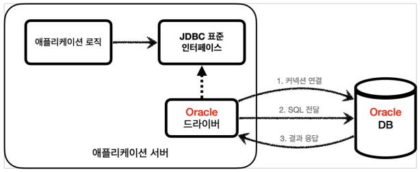 여기서 문제는 각각의 데이터베이스마다 커넥션을 연결하는 방법, SQL을 전달하는 방법, 그리고 결과를 응답 받는 방법이 모두 다르다는 점이다.