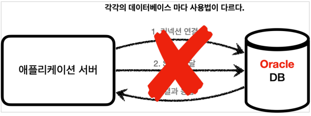 - 개발자가 각각의 데이터베이스마다 커넥션 연결, SQL 전달, 그리고 그 결과를 응답 받는 방법을 새로 학습해야 한다.