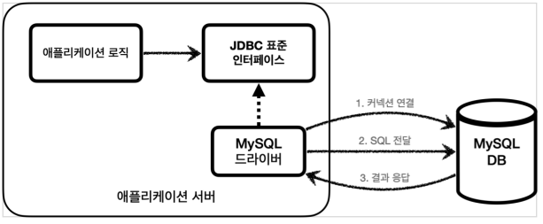 개발자는 표준 인터페이스에 맞추어 개발하면, MySQL 드라이버를 사용해 MySQL 데이터베이스와 연결, 전달, 응답을 하면 되는 것이다.