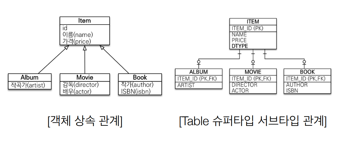좌측과 같이 객체의 상속 관계가 있고, 우측과 같이 데이터베이스의 관계가 있다고 하자.