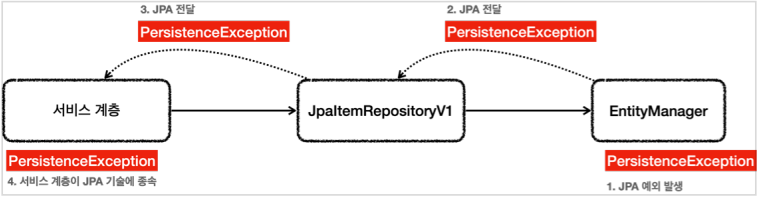 JPA의 경우 예외가 발생하면 JPA 예외가 발생한다.