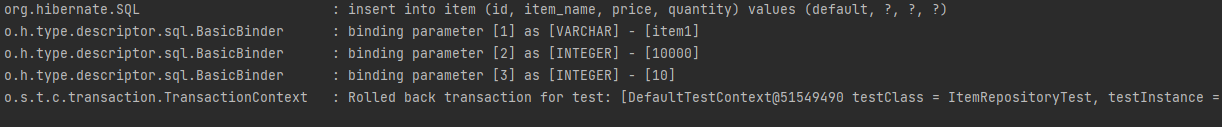 JPA가 만들어 실행한 SQL을 보면 id에 값이 null이나 default 혹은 빠져있다. PK 키 생성 전략을 IDENTITY로 했기 때문에 JPA가 이러한 쿼리를 만들어 실행한 것이다. JPA가 INSERT SQL 실행 이후 생성된 ID 결과를 받아서 넣어준다.