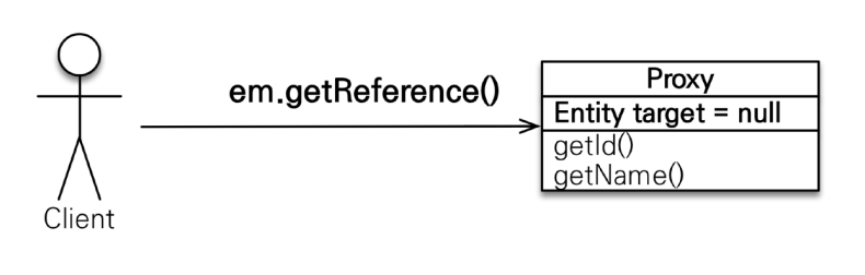 Entity target이 실제 레퍼런스가 들어갈 부분이고, 위의 코드로 보면 우선은 id만을 가지고 있는 가짜가 반환되는 것이다.