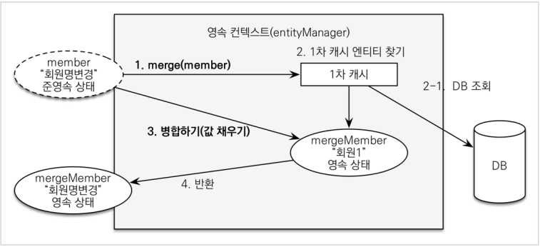 준영속 엔티티의 식별자 값으로 영속 엔티티를 조회하고 그 영속 엔티티의 값을 준영속 엔티티의 값으로 모두 교체하는 것이다.