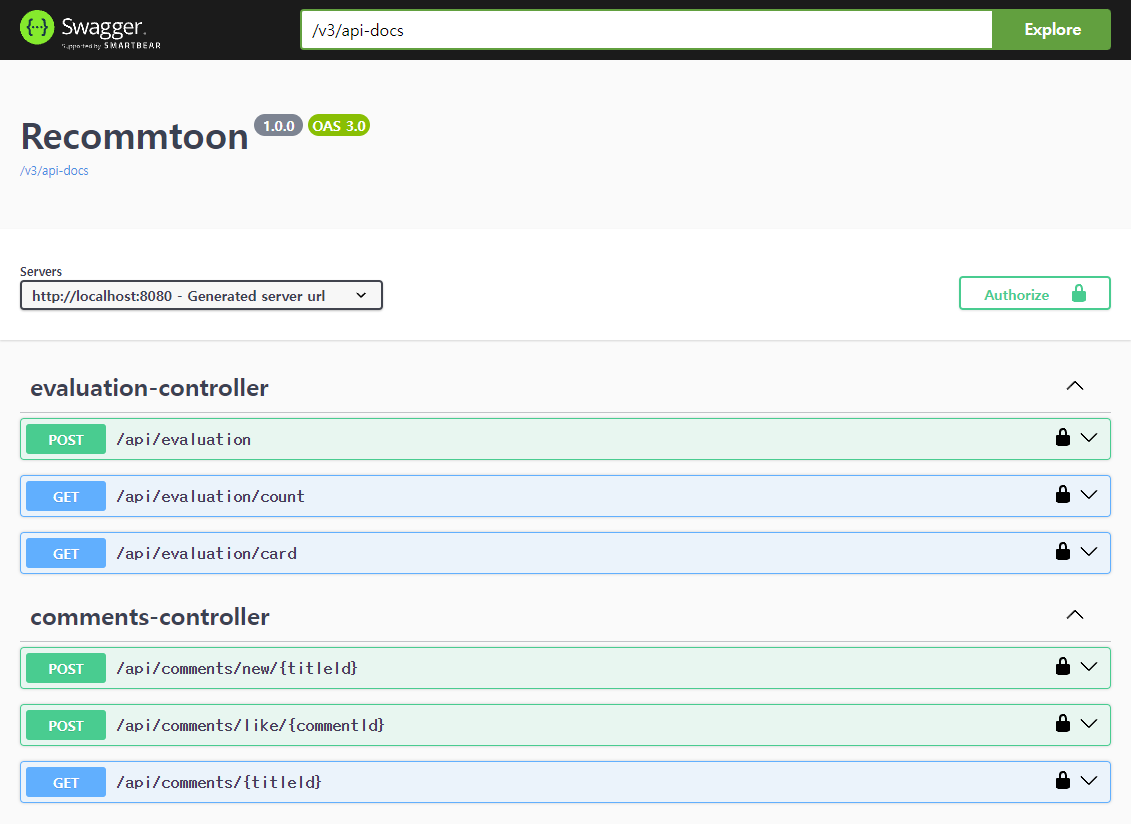 우선 내 Recommtoon 프로젝트는 1인 개발인 만큼 서비스가 크지 않고, 시간적인 여유도 부족하기 때문에 Swagger를 사용하기로 했다.