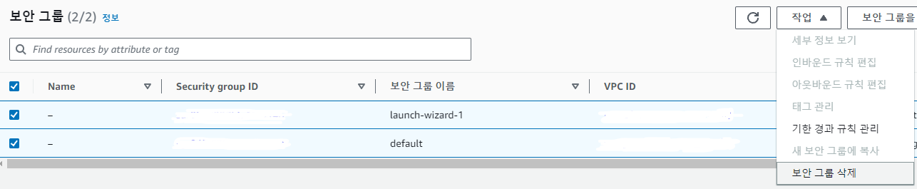 - 보안 그룹 삭제는 RDS 등을 사용했다면 바로 삭제가 되지 않을 수 있다.