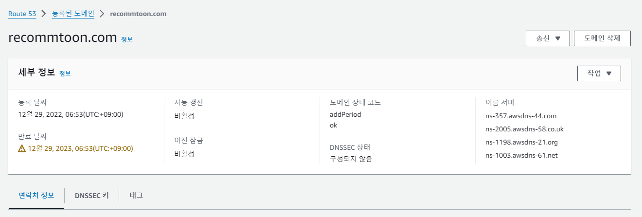 recommtoon.com 링크로 들어가면 아래와 같이 도메인에 대한 정보들이 나타나고 삭제 요청도 가능하다.