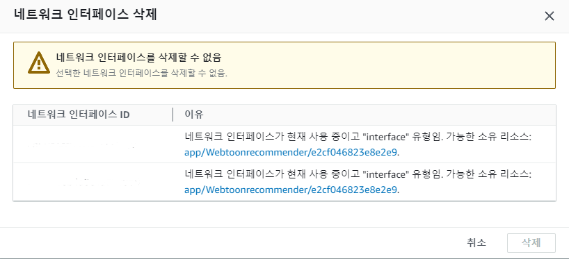두 보안 그룹 전부 삭제가 되지 않는다. 이유의 링크를 들어가니 네트워크 인터페이스가 2개 나타났고, 네트워크 인터페이스도 삭제를 시도했다.