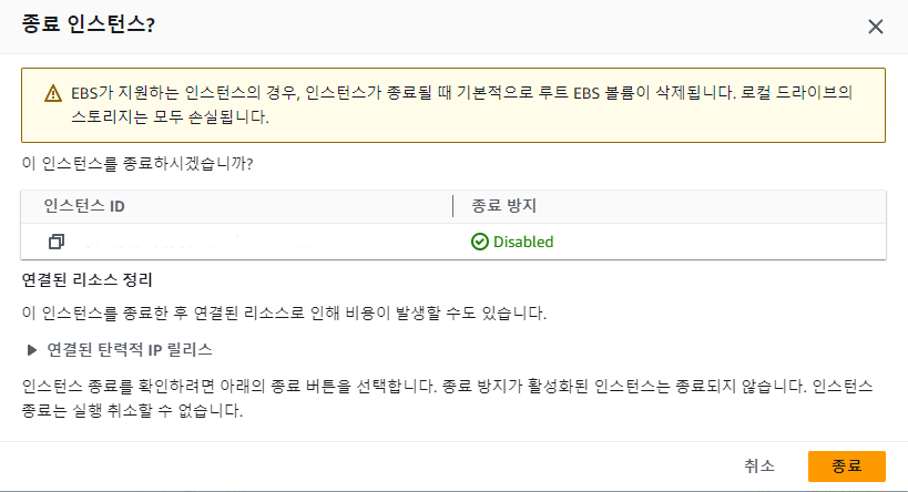 종료를 누르면 인스턴스가 종료가 되어도 인스턴스 목록에 몇 분 노출될 수 있다. 조금 지나면 목록에서도 사라지게 되며 목록에서 사라지지 않았더라도 종료되었기 때문에 접속이 불가능하기 때문에 상관없다.