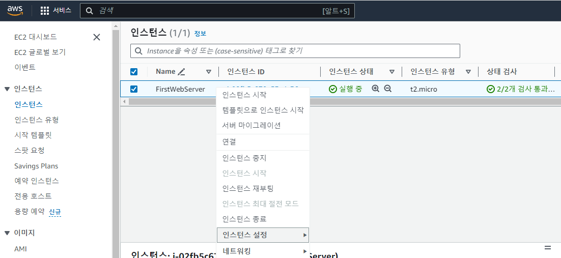 AWS에 접속해 로그인을 진행한 후 EC2 서비스를 접속하여 인스턴스를 확인한다.